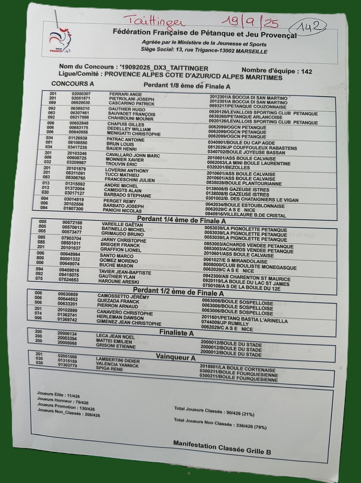Résultats du Taittinger A du 19 septembre 2025