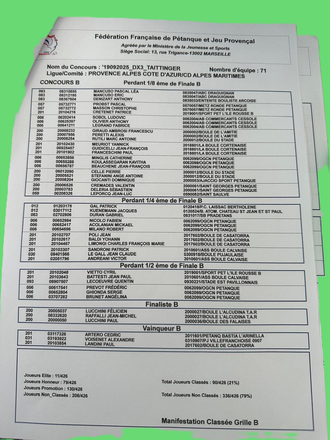 Résultats Concours Départemental Vétérans
